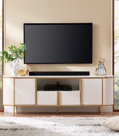 The Rosevell 70” TV Stand features a curved design, faux marble top, hidden storage, and clean cable management — ideal for modern spaces with TVs up to 78”.