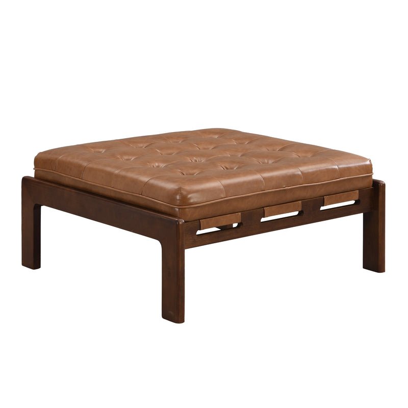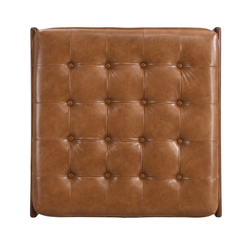 Crafted with a durable rubberwood frame and finished with a camel-colored tufted faux leather cushion, this piece serves as both a statement furniture item and a practical surface. Its 34” x 34” size makes it large enough to function as a coffee table ottoman or provide extra seating in your living room, bedroom, or guest area.