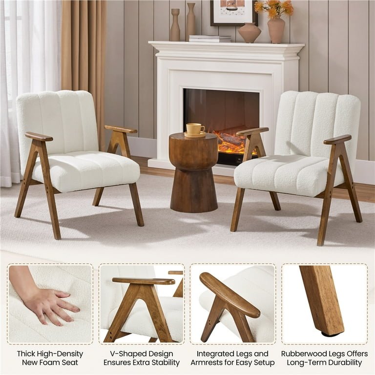 PakUnique Mid-Century White Bouclé Accent Chair – Upholstered Armchair with Wooden Legs