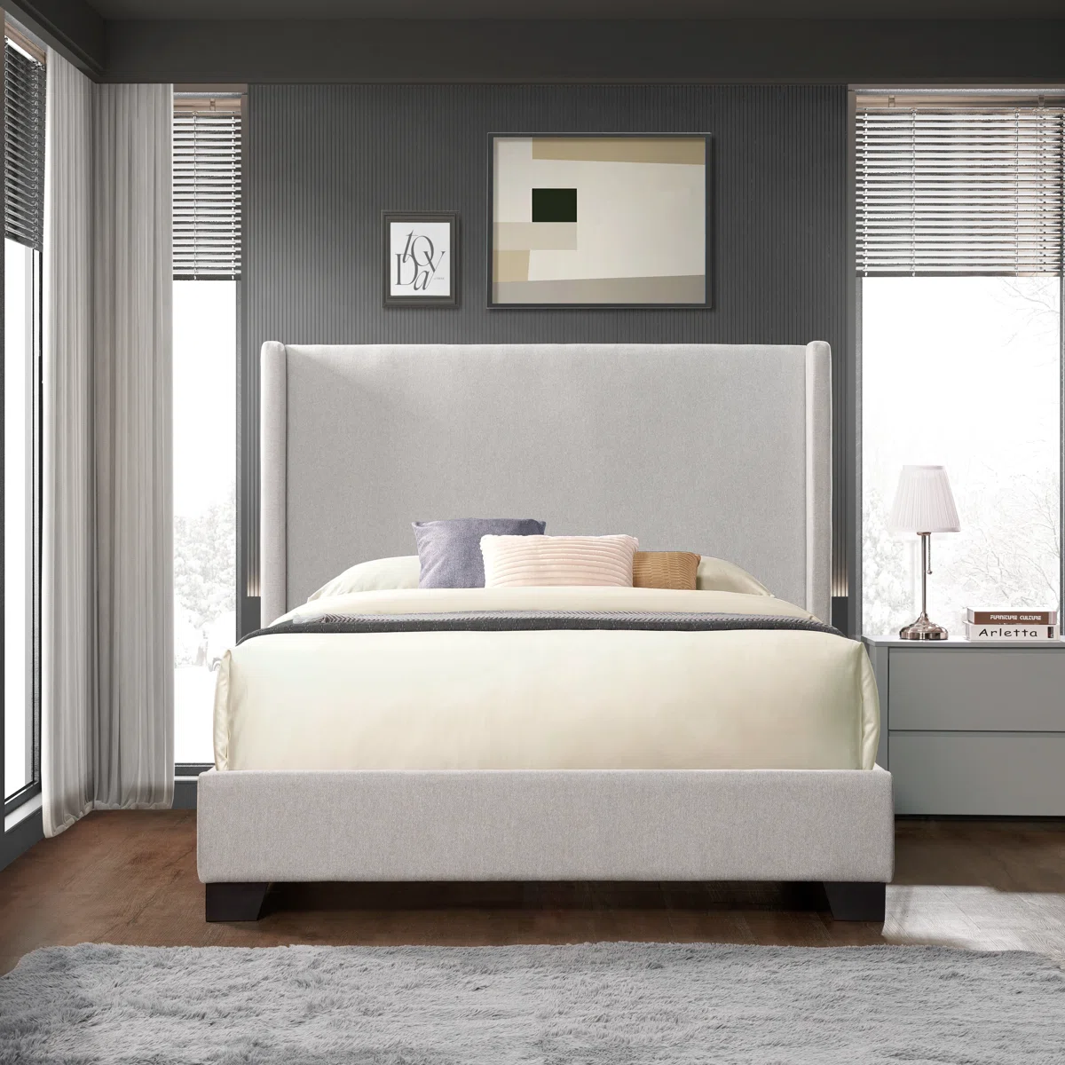 Step into luxury and modern sophistication with the Reinette Upholstered Wingback Platform Bed — where comfort meets refined design. This bed’s extra-tall, padded wingback headboard creates a stunning focal point while providing plush back support for reading, streaming, or simply unwinding at night.