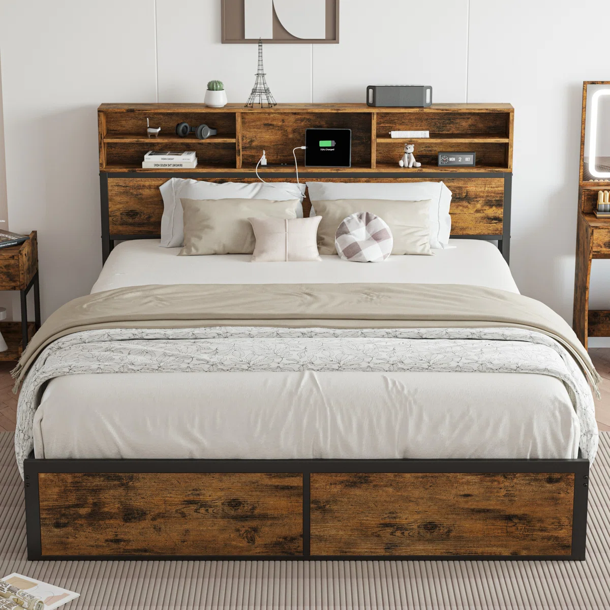 Storage Headboard – 5 open cubbies for books, decor, and nighttime essentials.