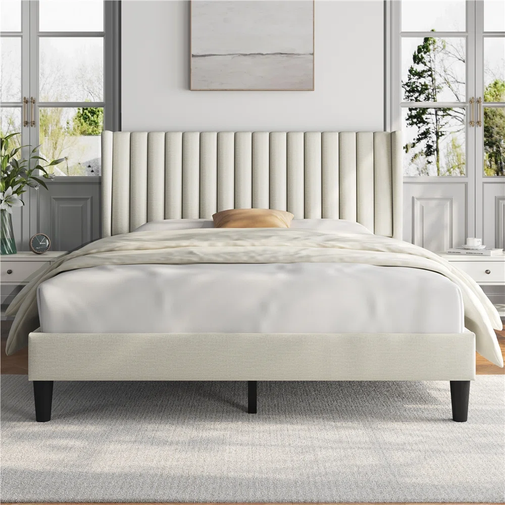 Upholstered Bed Frame with Wingback Headboard – Tufted Fabric & No Box Spring Required