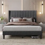 • Wingback Headboard Design – Geometric side wings add visual depth and a cozy feel.